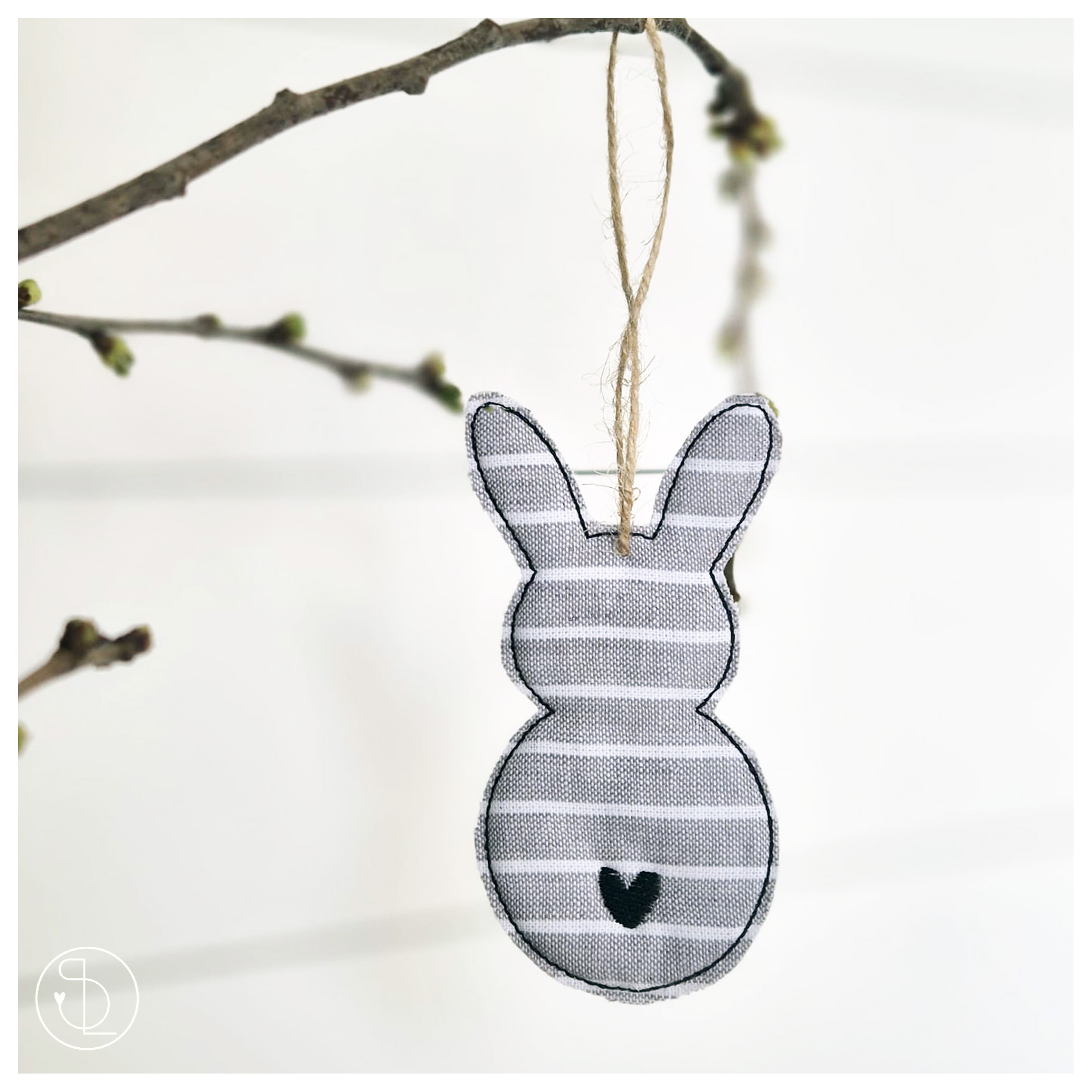 Der kleine Hase wird im 10×10 Rahmen gestickt – zuerst eine Lage Filz oder Volumenvlies und dann von vorne und hinten Baumwollstoff.