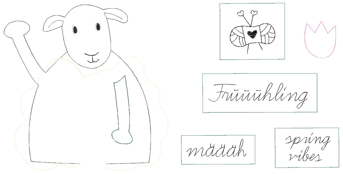 Enthalten sind der Stecker für den 10×10 und 13×18 Rahmen sowie die Schilder Früüüühling, mäh, spring vibes, Wollknäuel und eine Tulpe.