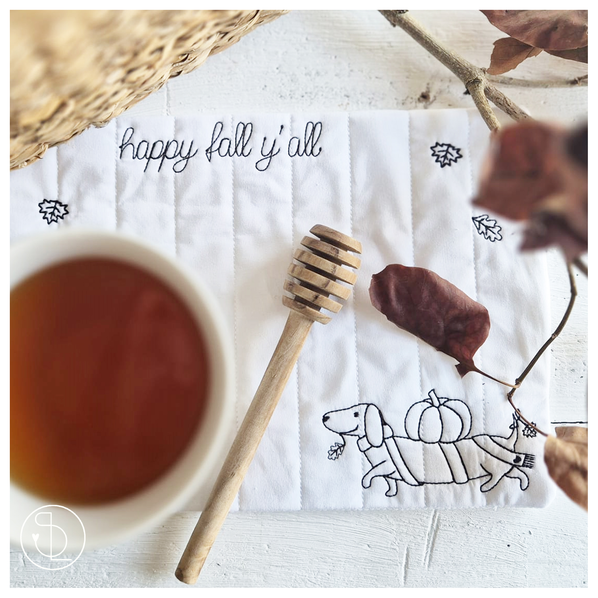 Herbstdackel Walter kannst Du mit den Rahmengrößen 10×10, 13×18, 16×26, 18×30 und 24×36 sticken. (Der abgebildete Mug Rug ist nicht in der Datei enthalten).