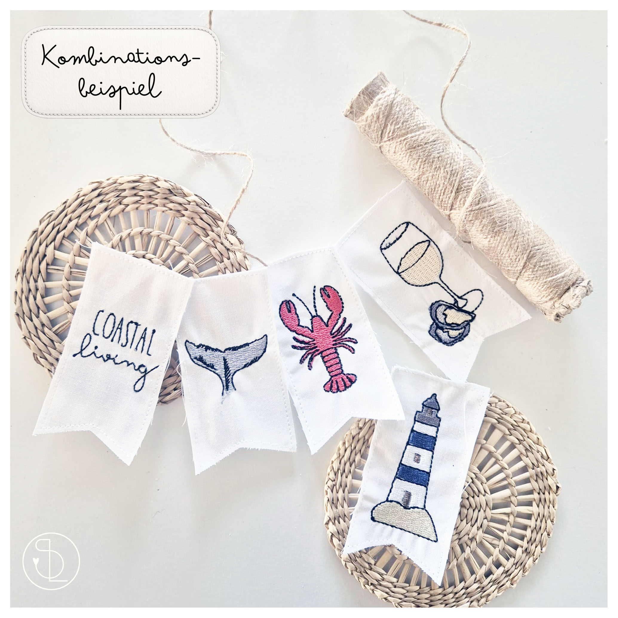 | Miniwimpel | coatal living, Hummer, Leuchtturm, Walflosse, Wein und Austern |