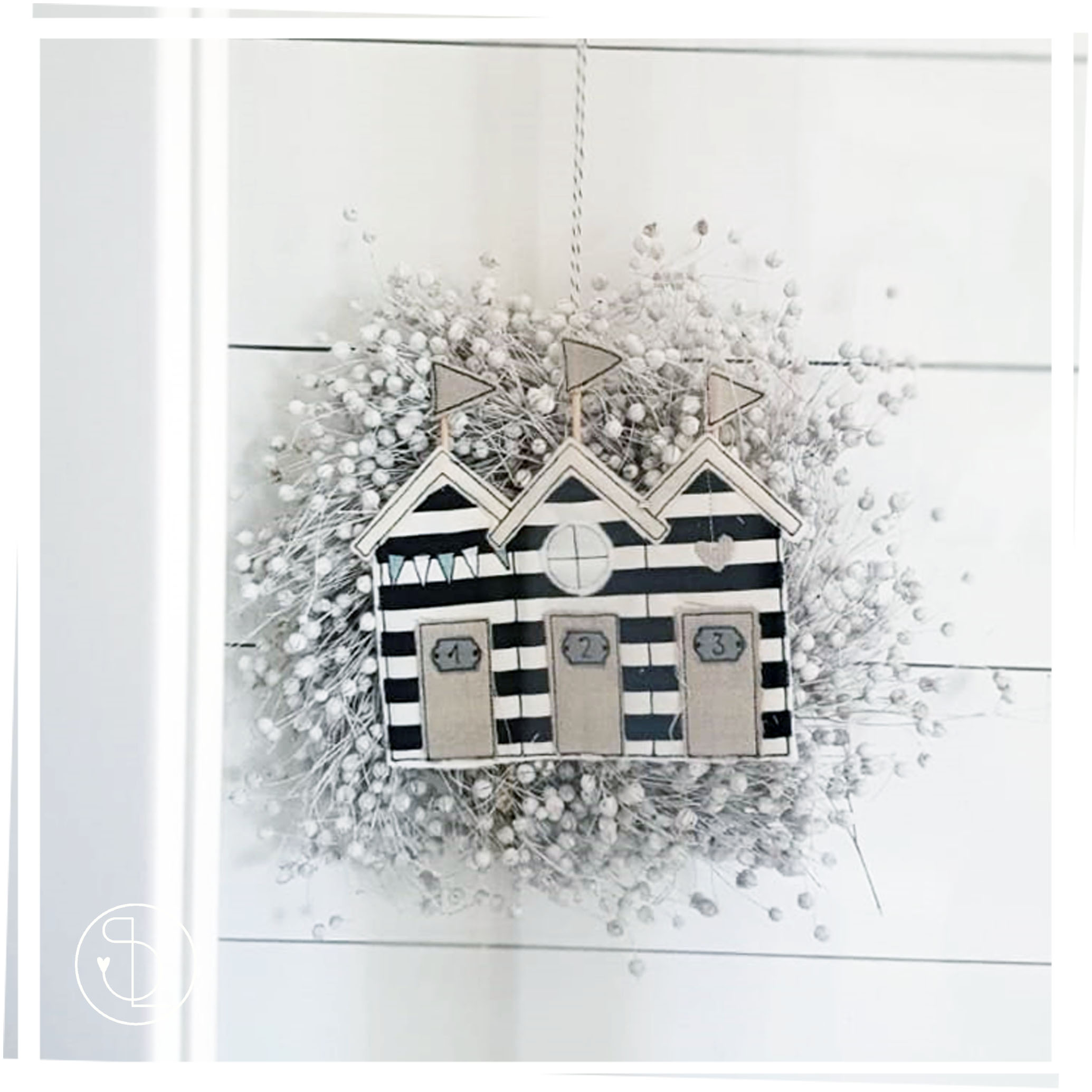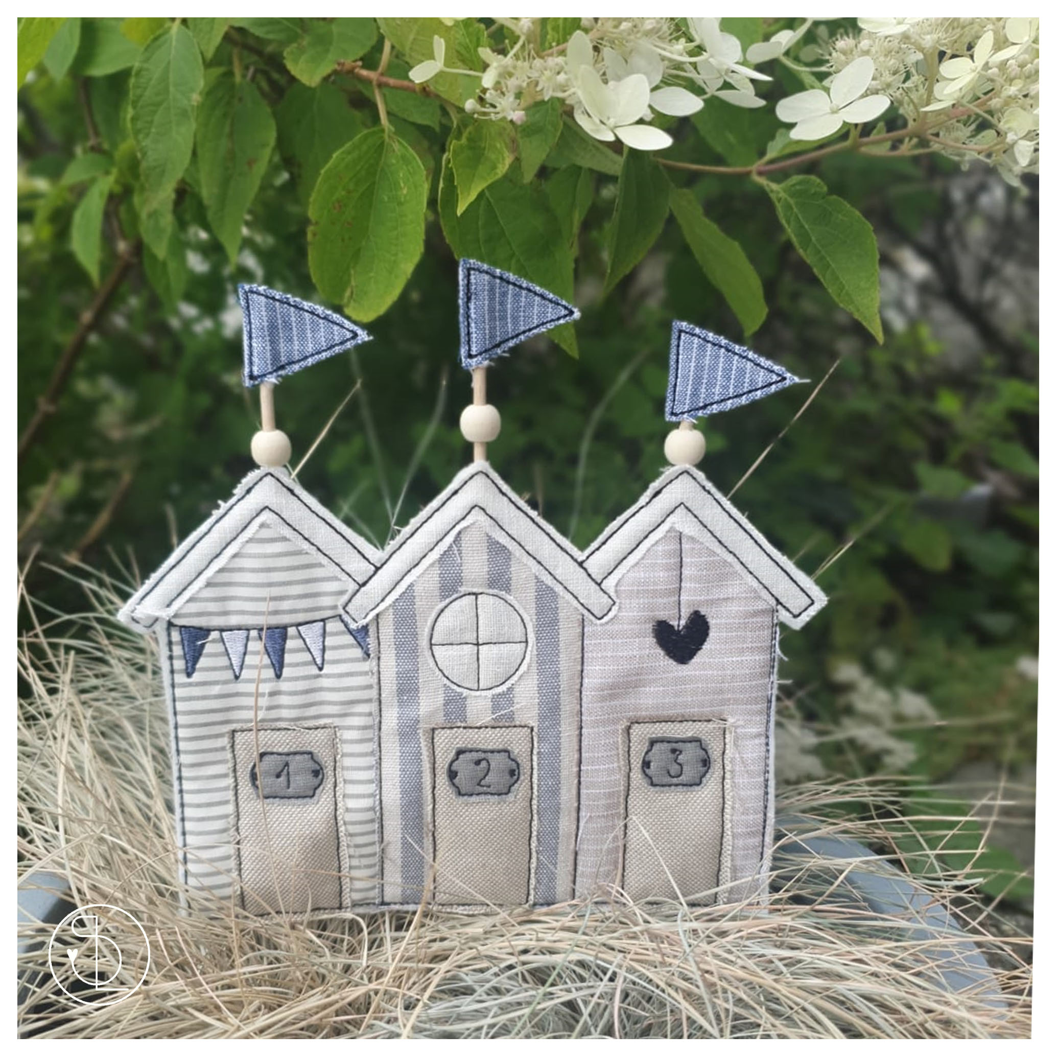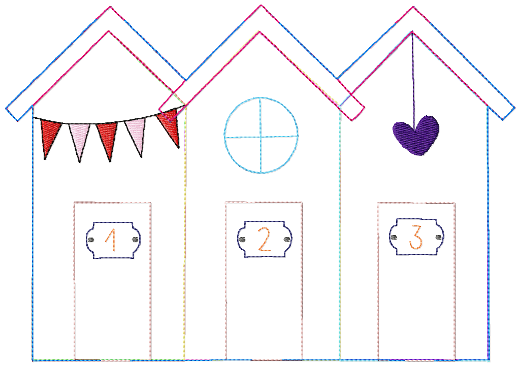 Die Strandhütten kannst Du im 13×18 oder 16×26 Rahmen sticken. Sie haben von hinten sichtbare Lücken an Ober- und Unterseite, durch die Du Stäbe für die Fähnchen bzw. als Blumenstecker stecken kannst.
