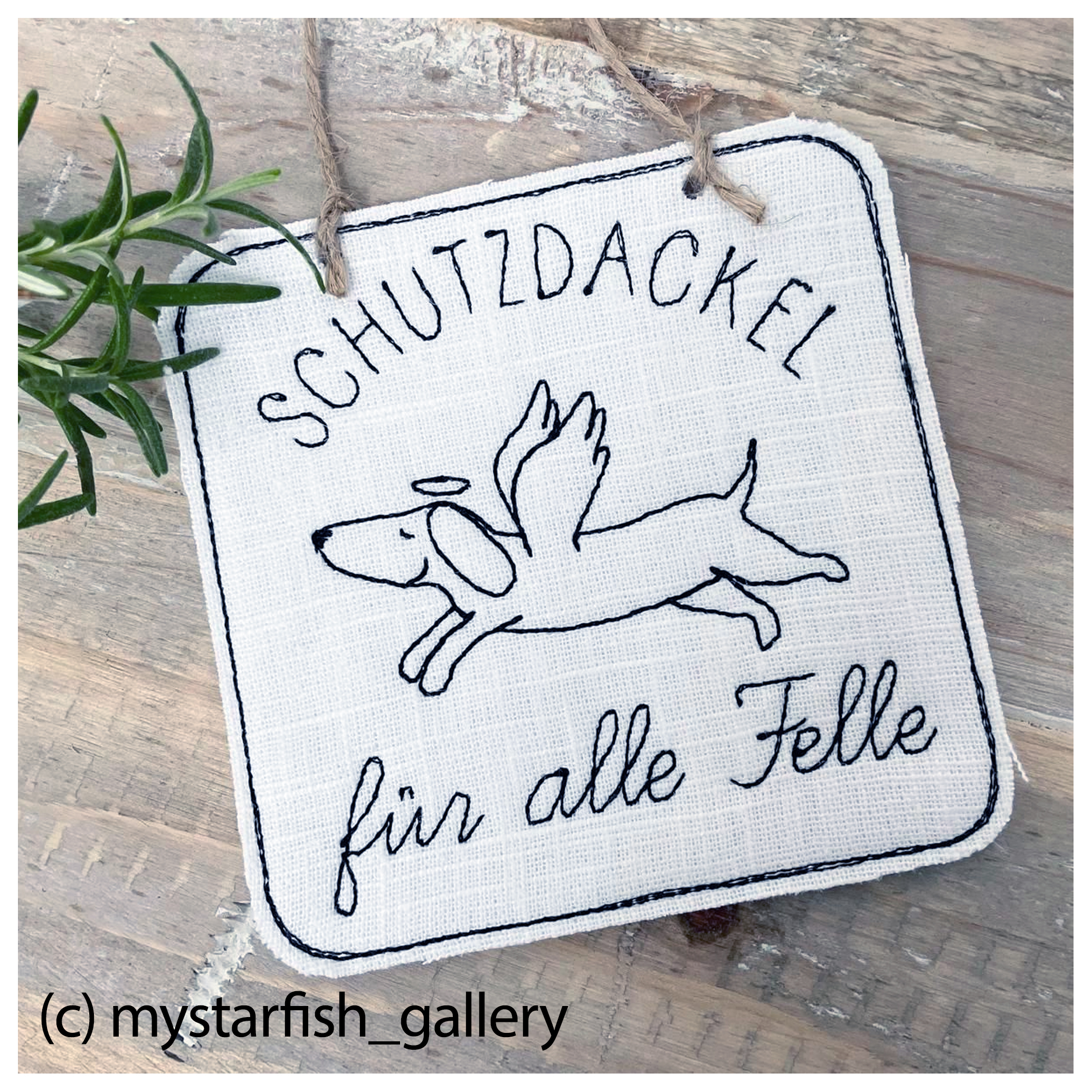 Der “Schutzdackel” wird im 10×10 Rahmen gestickt, wahlweise mit englischer oder deutscher Beschriftung.