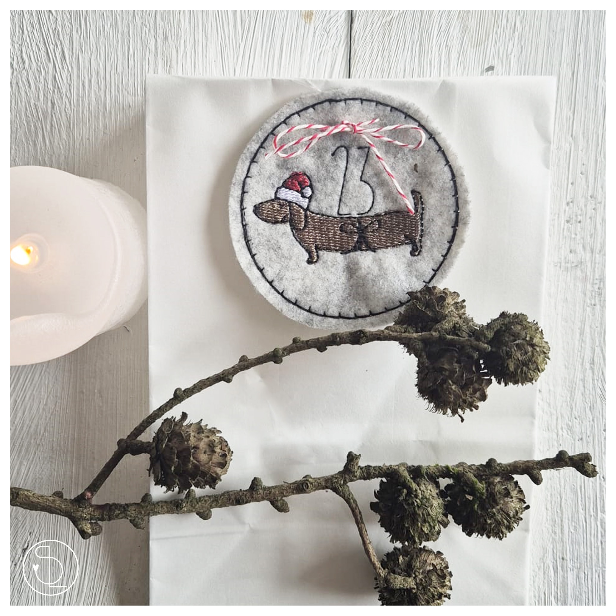 Die Anhänger 1 – 24 werden im 10×10 Rahmen gestickt und sind ca. 6,5 cm im Durchmesser.